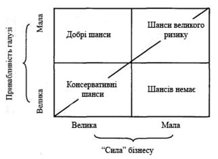 для кожної стадії життєвого циклу галузі. Що стосується сильних сторін бізнесу, то вони визначаються такими показниками, як загальна конкурентоспроможність бізнесу, відношення менеджменту до ризику, наявність патентів, гарантійного обслуговування, вертикальної інтеграції, загальна ефективність виробництва.