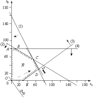 Умова невід’ємності змінних х1 ≥ 0, х2 ≥ 0 обмежує область допустимих планів задачі першим квадрантом системи координат. Переріз усіх півплощин визначає область допустимих планів задачі — шестикутник OABCDE. Координати будь-якої його точки задовольняють систему обмежень задачі та умову невід’ємності змінних. Тому поставлену задачу буде розв’язано, якщо ми зможемо відшукати таку точку багатокутника OABCDE, в якій цільова функція Z набирає найбільшого значення.