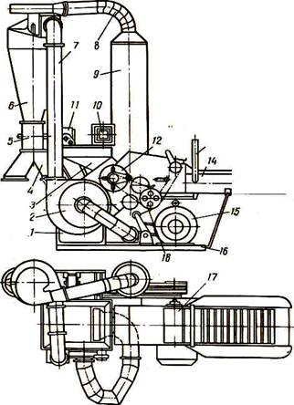 — рукави вивантаження; 5 — шлюзовий затвор; — циклон; 7 — кормовий трубопровід: — повітряний трубопровід; — фільтрувальний рукав; — амперметр-індикатор; черв'ячний редуктор; — ножовий барабан; — важіль вмикання; — живильний транспортер; 15 — електродвигун; — рама; — підпресовувальний транспортер; — редуктор.