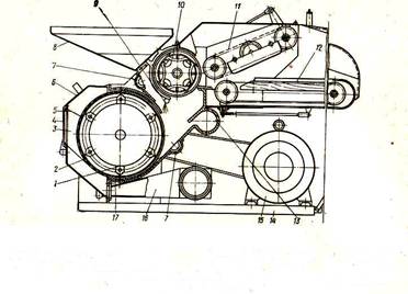 — змінне решето; — зарешітна камера; — викидний люк; 5 — вставна викидна горловина; — кришка дробильної камери; 7 — магнітний сепаратор; — ківш для сипких кормів; — патрубок для води; — різальний барабан; — підпресувальний транспортер; — живильний транспортер; — приймальний транспортер; — рама; — електродвигун; — відсмоктувальний патрубок вентилятора;