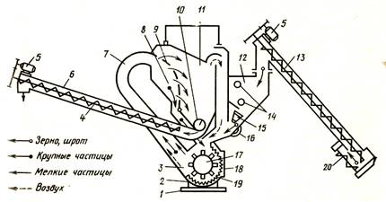 продукт через регульоване щілинне вікно надходить на магнітний сепаратор 7 і далі в дробильну камеру. Вентилятор відсмоктує подрібнений продукт, який через патрубок відсмоктувача проходить у нагнітальну трубу і з струменем повітря надходить у циклон. Тут продукт відділяється від повітря завдяки обертальному рухові струменя під дією відцентрових сил, які притискають частинки корму до внутрішньої поверхні циклона. Сили тертя, що з'являються при цьому, гасять енергію руху частинок, які й осідають у циклоні. Через шлюзовий затвор продукт спрямовується на дальшу обробку. Повітря з циклона по трубопроводу надходить назад у дробильну камеру через патрубок Частина повітря через фільтр-рукав циклона, що утримує пиловидні частинки, надходить в атмосферу.