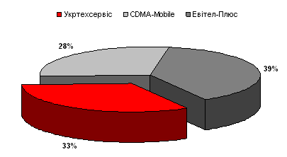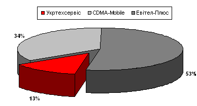 Отже, з наведених даних можна зробити висновок, що лідером по підключенню до операторів зв’язку СDMA в даному регіоні є компанія Евітел-Плюс. В 2006 році дане підприємство займало 39% ринку. Укртехсервіс збільшило кількість підключень за рік на 165 чол, або на 70%, що склало близько 33% ринку.