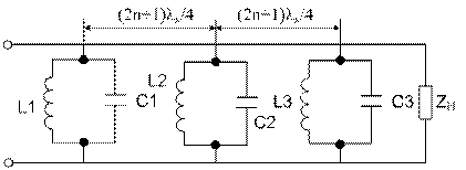При реалізації такої схеми в діапазоні НВЧ основним елементом смугового фільтра є прохідний резонатор (резонатор з діафрагмами на вході та виході), еквівалентний паралельному контуру, і ввімкненому в лінію паралельно.