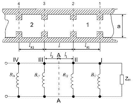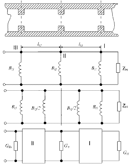У техніці НВЧ широко застосовуються хвилеводні смугові фільтри, виконані за східчастою схемою. Еквівалентна схема таких фільтрів збігається зі схемою східчастих фільтрів з реактивними елементами і зосередженими параметрами (рис. 5).