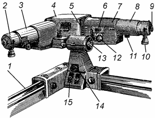 Вихідна труба 3 з щілиною 2 збирає промені світла, які пройшли через диспергуючу призм 434f56e ;у 4. Щілину 2 можна розглядати через мікроскоп.