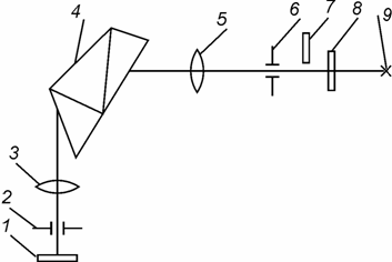 Принцип дії приладу полягає у такому. Пучок світла від джерела 9 (рис.2) проходить через вхідну щілину 6 і падає на об’єктив коліматора 5. Після об’єктива промені виходять паралельним пучком і падають на диспергуючу призм 434f56e ;у 4, яка повертає їх на кут 90 і розкладає у спектр. На шляху пучка світла поміщують вхідну трубу монохроматора, яка складається з об’єктива 3 і щілини 2. Повертаючи призм 434f56e ;овий столик на різні кути відносно падаючого пучка світла, одержують у вхідній щілині світло з різною довжиною хвилі, яке проходить через призм 434f56e ;у при мінімальному відхиленні.