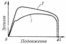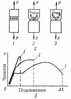 діаграма розтягу зразків з надрізами: 1 без надрізу, 2 з тупим надрізом, 3 з гострим надрізом |
