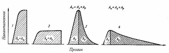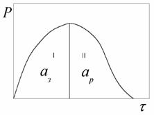 Останнім часом одержала поширення осцилографічна методика поділу ударної в'язкості на складові. О.А.Бакши, А.Н.Монашков і ін. запропонували простий і зручний спосіб визначення складових ударної в'язкості. У процесі випробування записується осцилограма ”зусилля – час” (рис. 5.12). Повна робота, що витрачається на деформування і руйнування надрізаного зразка, пропорційна площі під осцилограмою. Форма кривої залежить від максимального навантаження і тривалості удару. Через максимальне значення ординати осцилограми проводять пряму, перпендикулярну осі абсцис, що розділяє площу під кривою на дві частини (I і II). Перша частина пов'язана із процесом пружної і пластичної деформації зразка до моменту утворення тріщини, друга характеризує зміну зусилля в процесі розвитку цієї тріщини. Витрати енергії, що характеризуються I і II частинами осцилограми, віднесені до площі перерізу зразка, і є складовими ударної в'язкості а3 і ар.