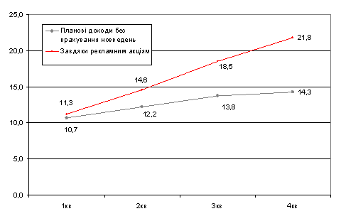 отримати 1024 тис.грн виручки від реалізації мобільних телефонів. Враховуючи що природній приріст ринку мобільних телефонів складає 20% на рік, то ми бачимо, що без нововведень підприємство тримало б 722,4 тис.грн тис. доходу, що на 301,6 тис.грн менше.