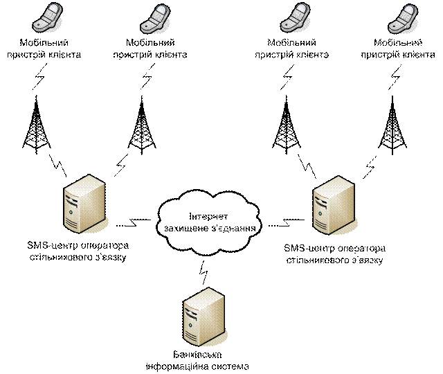Рис. 2.9. Схема взаємодії банку та стільникових операторів при наданні послуг SMS-банкінгу