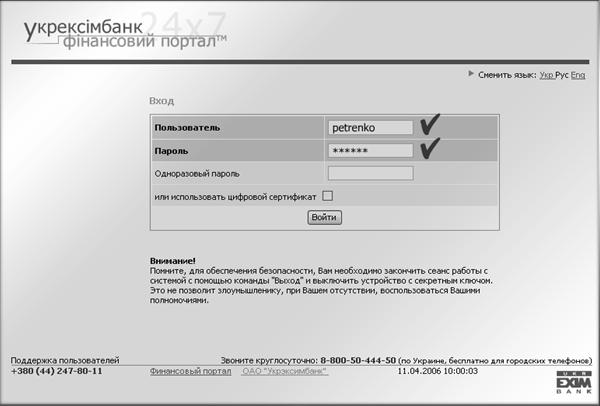 сувору взаємну аутентифікаці& 111g61b #1102; клієнта та банку за допомогою цифрових підписів і шифрування переданих даних, захист за допомогою паролів і ключових дискет. Для взаємної аутентифікаці& 111g61b #1111; клієнта та банку використовується протокол захисту даних CSafe, розроблений відповідно з рекомендаці& 111g61b #1081; НБУ. Протокол базується на стандарті ISO 10181 та використовує стандартний інтерфейс до безкоштовної та загальнодоступної бібліотеки захисту інформаці& 111g61b #1111; OpenSSL. При цьому використовуються алгоритми цифрового підпису, шифрування і хешування RSA, RC4 і SHA, які широко застосовуються в аналогічних системах найбільшими корпораці& 111g61b #1103;ми і державними установами в усьому світі;