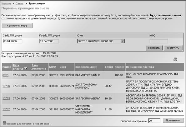 зв'язку, проводити безготівкові внутрішньобанківські і міжбанківські платежі, переводити кошти по своїх рахунках, і, звичайно, відслідковувати всі банківські операці& 111g61b #1111; за своїми рахунками за будь-який проміжок часу.
