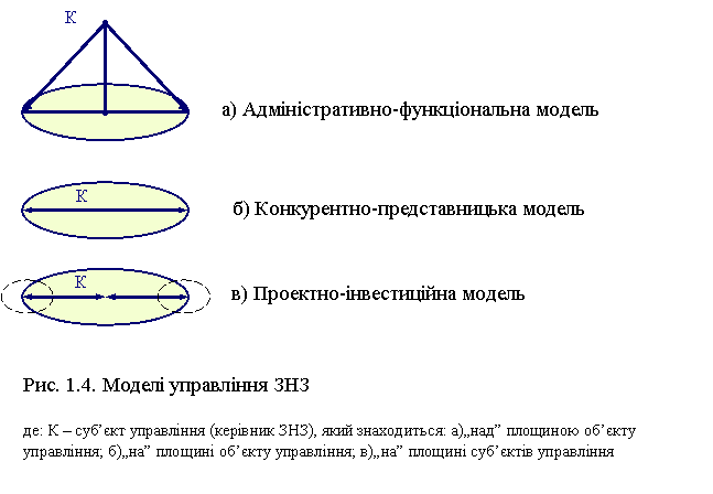 У період переходу України до ринкових відносин для ЗНЗ актуальним стає питання застосування теорії педагогічного менеджменту, що дає можливість запровадити додаткові об’єктивні критерії оцінювання результативності праці кожного працівника, а керівника – наблизити до його проблем. У такій освітній організації утверджується демократичний стиль управління; пріоритетними стають колегіальні форми управління; організаційною структурою лінійно-функціональна; підвищується конкурентоспроможність закладу освіти, він набуває позитивного іміджу , під яким в теорії розуміється “образ натуралізованої реальності, який описує природу явища, його сутність без прикрас і культурної обробки”[]. Таку організаційну модель управління називають конкурентно-представницькою, в ній керівник (К) розміщується у площині об’єкту управління і відіграє важливу роль у формуванні іміджу ЗНЗ спільно з іншими членами колективу. У колективі діє єдина команда. Така модель обґрунтовується науковими засадами теорії менеджменту