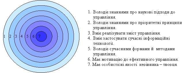 Л. І. Даниленко розробила модель готовності керівника ЗНЗ до управління інноваційною діяльністю – модель інноваційного менеджера. Вона включає в себе: сукупність знань, наукових основ управління і менеджменту, в т.ч. менеджменту освітніх інновацій, умінь і навичок здійснювати ефективне управління, мотивацію управлінської діяльності та особистісні і професійні якості, які є її “серцевиною” ( рис. 1.5) [].