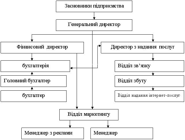 Отже, з 848h77i ;а даними схеми можна зробити висновок. На підприємстві діє 3 структурних підрозділи: 1 – фінансовий відділ, що відповідає за фінансову діяльність, прийняття управлінських рішень з фінансового менеджменту; 2 – відділ маркетингу – що відповідає за просування послуг на ринку збуту, та 3 – відділ надання послуг, що фактично виконує виробничі функції підприємства.