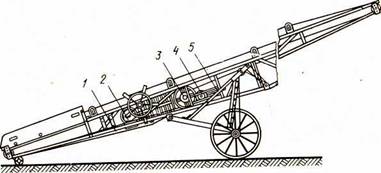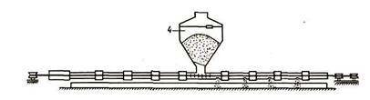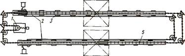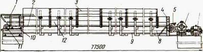 вальний бункер 1, дерев'яні секції годівниць, транспортерний ланцюг 8 з скребками. Рух ланцюга здійснюється від приводної станції, а натяг ланцюга — від натяжної станції