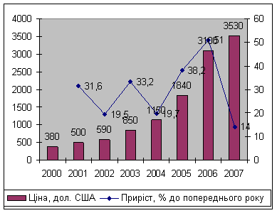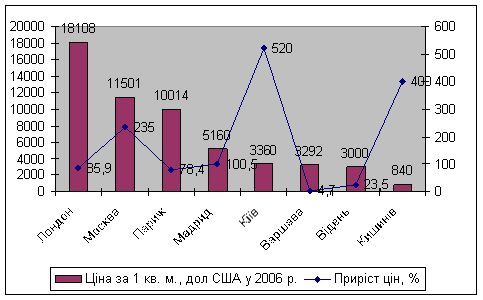м. у новобудові складала біля $ 2500. З початку 2007 року ку піднялася на 10 – 15%. Для порівняння у 2006 році ціни показували досягав 60 – 70% у рік. Ринок житла перейшов в іншу фазу – загострен