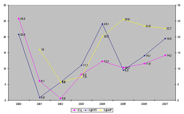 (з 16% у 2001 р. до 5,8% у 2002 р.) цінових індикаторів (рис. 9). За п'ять років (2003 – 2007 рр.) ціни на буді майже у 2,5 раза і продовжували зростати високими темпами і в 2007 р., який це буде вплив, важливо проана