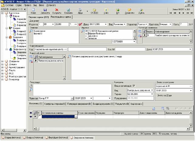 Автоматизована система к& 222j93c #1086;нтролю і організації документообігу АСКОД призначена для автоматизації процесів обробки кореспонденції шляхом використання у документообігу сучасних комп’ютерних технологій. Система охоплює опрацювання вхідної, вихідної кореспонденції, внутрішніх документів та звернень громадян, контролю за їх проходженням і виконанням.