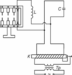 освітлювальної мережі через знижувальний трансформатор Тр до електродів, виготовлених з металів, що досl 737h73h 3;іджуються, Для того, щоб іскра була більш яскравою, паралельно котушці К додатково увімкнено котушку індуктивності L C