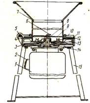 | 5 — палець шарніра; 6 — спеціальний болт; 7 — бункер; 8 — маточина верхнього диска; 9 — верхній диск з ножем; подрібнювання; — вертикальні ножі;13 — лопаті нижнього диска; 14 — маточина викидача; 15 — станина. |
