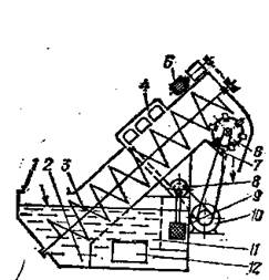 бункер; 2 — каменевловлювач; 3 — гвинтова мийка; 4 —зрошувач; 5, 10 — електроприводи; 6 -барабан-подрібнювач; 7 — дека; 8 — водяний насос; 9 — фільтр; 11 — ванна для води; 12 — люк.