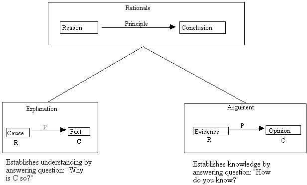 Now we can formalize the distinction between knowing and understanding as follows. There are two kinds of rationales. The first we call an argument, the second we call an explanation. An argument is an attempt to answer the question "How do you know C (the conclusion) is true?" or "Why should one believe C to be true?" When we ask a question like this, we are thinking of the conclusion as a person's opinion and we are looking for a reason to believe that opinion. A reason to believe something is what we call evidence.