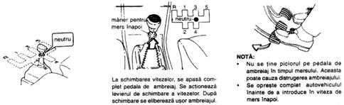 Pentru a introduce maneta in treapta a I-a de viteza pozitia cea mai buna a mainii drepte este cu fata palmei spre stanga fara a strange degetele pe nuca din capul manetei, iar din punctul neutru se trage usor de maneta catre stanga (spre picior) dupa care se va impinge maneta cu podul palmei catre inainte. Aceasta miscare se va face fara a incerca miscari in diagonala sau eliminarea unghiurilor drepte, asa cum reiese din schema .(fig.2) Manevrarea din tr. a I-a in tr. a II-a de viteza se va face presand usor maneta cu fata palmei spre stanga(spre picior) si tragandu-l inapoi in doi timpi, facand o mica pauza pe linia punctului neutru. Manevrarea din tr.a-II-a in tr. a-III-a de viteza se va face impingand usor cu podul palmei maneta in fata lasand pentru o fractiune de secunda nuca libera (aceasta revenind automat in pozitia neutru datorita unui resort) dupa care se va continua impingerea acesteia usor cu podul palmei pana ce aceasta va ajunge in pozitia 3 (conform fig.2). Manevrarea din tr.a-III-a in tr. a IV-a se va face tragand maneta spre inapoi paralel cu axul longitudinal al masinii (cu o mica pauza in punctul neutru) pana ce aceasta va ajunge in pozitia 4.