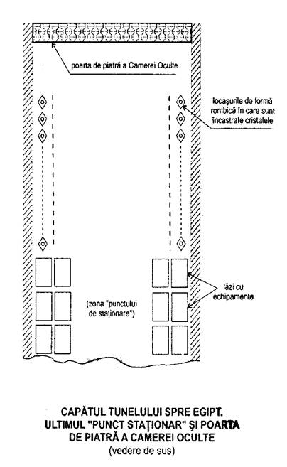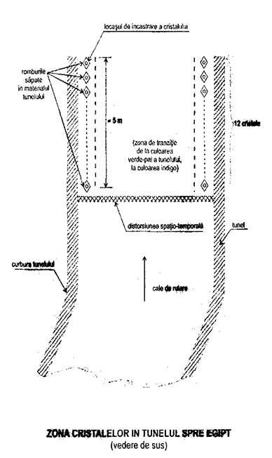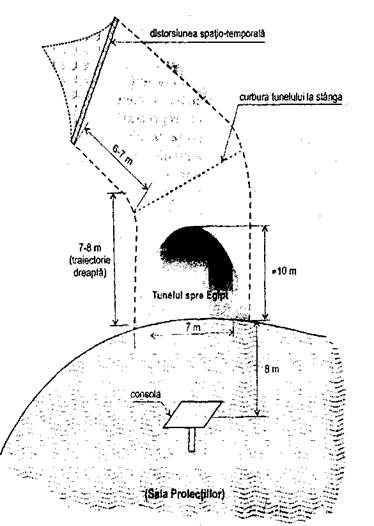 Am urmarit sa ma adun si sa dau o anumita coerenta primei mele experiente de deplasare în timp. Fara îndoiala ca instalatia a preluat si a modulat temporal impresia cea mai puternica din subconstientul meu, proiectându-ma cu un an în urma în locatia respectiva. Totul era atât de viu si de clar, chiar mai bogat în trairi si perceptii decât în varianta fizica! Am închis din nou ochii încercând de aceasta data sa ma proiectez într-un moment temporal ales de mine prin vointa proprie. Cautam febril în minte un astfel de reper, urmarind sa-mi dau seama ce anume m-ar putea interesa mai mult. Am sesizat ca atunci spatiul negru din fata ochilor "tremura" sau, mai bine zis, facea valuri, iar în anumite regiuni ale sale apareau crâmpeie ininteligibile de imagini, care mai apoi dispareau într-o fractiune de secunda. Simteam cum fierbinteala din frunte creste din nou tot mai mult astfel ca, în disperare de cauza, am ales din milioane de posibilitati sa ma proiectez în timpul constructiei tunelului secret de la Marea Piramida catre Camera Oculta. Proiectia temporala a fost instantanee, foarte dura, ca un fel de "izbitura". Am vazut niste lumini orbitoare într-un spatiu de sectiune triunghiulara, la fel cu cea a tunelului vazut de noi în imaginile holografice ale computerului lui Aiden. Acolo exista un