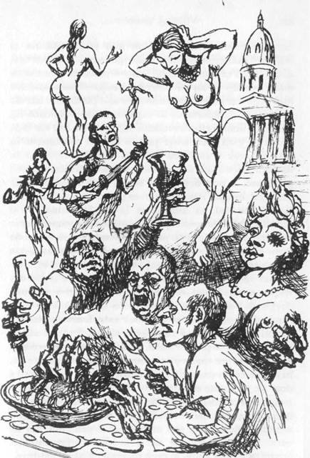 īn loc de asa ceva, ce am avut noi īn seara aceasta? A fost o autoritate municipala īn sos Graft, dar eu unul n-am putut detecta la el aroma unei avaritii cu adevarat pasionale si brutale care sa ne desfete ca unul din marii magnati ai secolului trecut. Nu-i asa ca era negresit un Om Marunt - o creatura a comisioanelor meschine ce facea glume meschine īn intimitate si le nega īn discursurile sale publice cu cele mai rasuflate platitudini, o marunta si viermuita nonentitate ce a ratacit īn coruptie si tocmai a realizat ca era corupta, iar asta fiindca toti ceilalti faceau la fel? A urmat sleita Tocana de Adulterini. Ati gasit īn ea vreo urma de patima cu adevarat īnflacarata, sfidatoare, rebela si nesatula? Eu n-am gasit asa ceva. Toti au avut pentru mine gustul unor imbecili subsexuati ce au nimerit ori s-au strecurat īn paturi nepotrivite ca raspuns automat la reclamele sexy, sau