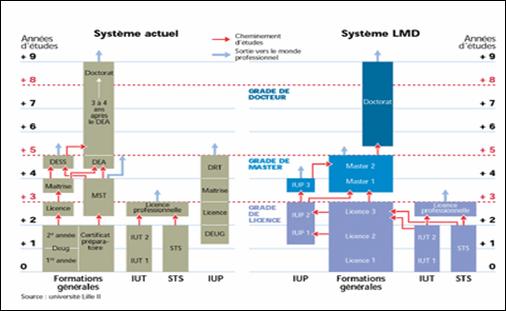 L'instauration du LMD contraint les universités françaises à réviser leur offre de formation en profondeur : désormais, le Deug (diplôme d'études universitaires générales) et la maîtrise, respectivement préparés en deux et quatre ans après le bac, ne sont plus que des titres intermédiaires, délivrés entre la licence et le master [ce dernier diplôme devant remplacer à terme le DEA (diplôme d'études approfondies) - avec un master recherche - et le DESS (diplôme d'études supérieures spécialisés ) - avec un master professionnel].