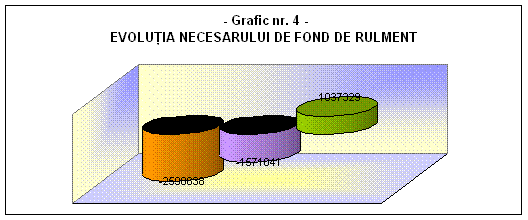 Din punct de vedere al vitezei de rotatii a fondului de rulment (VFRN), durata in zile a unei rotatii nu se situeaza intre marja de securitate minima si marja de securitate maxima. In anii 2005 si 2006 viteza de rotatie a fondului de rulment depaseste cu mult marja de securitate maxima, ceea ce reprezinta o situatie negativa. In anul 2007, insa, VFRN se situeaza sub marja de securitatea minima, avand aceeasi semnificatie. Avand in vedere compararea FR cu CA , marimea optima a FR ar trebuie sa reprezinte 1/3 din CA. In acest caz FR nu inregistreaza marimea optima in nici unul din cei trei ani.