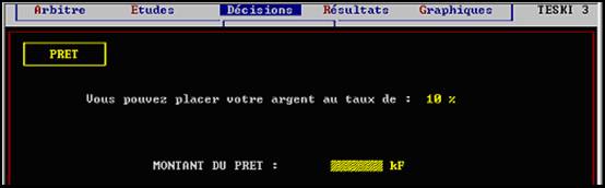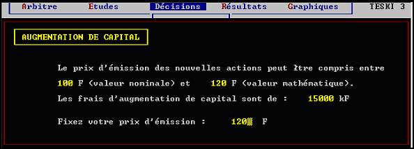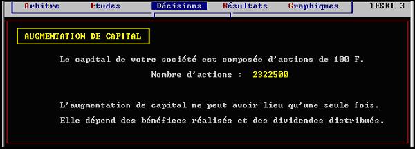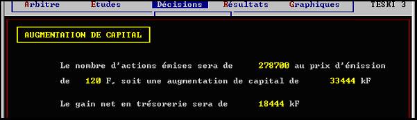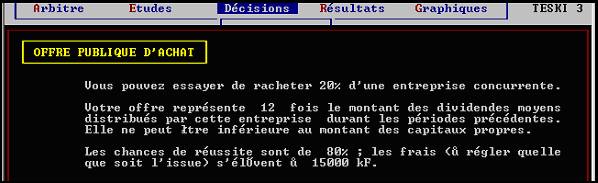 Ø Plasamente de capital. Plasamentele pot fi facute si in capitalul unei alte intreprinderi concurente. Oferta publica de cumparare poate fi incercata numai de o intreprindere (aceea care solicita prima aceasta operatiune), o singura data in simulare. O echipa poate prelua 20% din capitalul unei intreprinderi concurente. Sansele de reusita ale acestei operatiuni sunt de 80%. De regula intreprinderea cumparatoare trebuie sa plateasca de 12 de ori suma dividendelor medii distribuite de intreprinderea cumparata. Oferta publica de cumparare este o operatiune care antreneaza cheltuieli suplimentare de 15.000 um. Aceste cheltuieli afecteaza trezoreria intreprinderii chiar si in caz de esec.