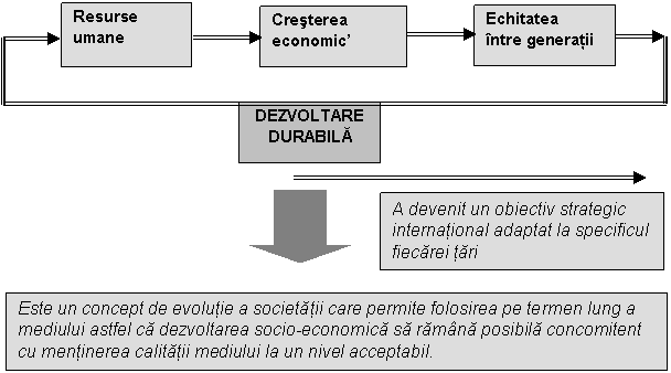 Dezvoltarea durabila este :"Un proces al schimbarii in care valorificarea resurselor, dirijarea investitiilor, orientarea dezvoltarii tehnologice, schimbarilor institutionale si capacitatea biosferei de a prelua efectele activitatilor umane sunt compatibile cu cerintele viitorului ca de astfel si cu cerintele prezente". |