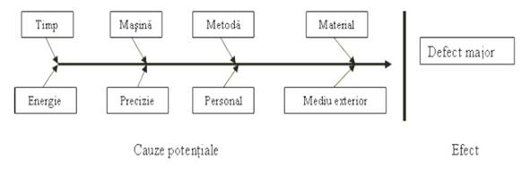 – Diagrama cauza – efect, numita si diagrama Ishikawa. Aceasta tehnica permite identificarea cauzelor succesive ale aparitiei unei „probleme”. Un exemplu generic de diagrama este prezentat mai jos: