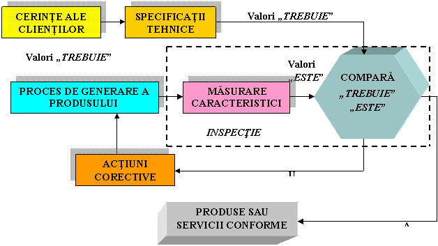 Controlul calitatii se refera la acea parte a managementului calitatii concentrata pe indeplinirea cerintelor referitoare la calitate. Controlul calitatii este un proces de mentinere a standardelor, si nu de generare a acestora. Acest proces presupune o etapa prealabila de alegere/stabilire a performantelor de calitate dorite sau specificate (valori TREBUIE), urmata apoi de masurarea continua sau esantionata a performantelor realizate (valori ESTE), compararea lor generand corectii ale procesului astfel incat produsele rezultate sa fie conforme cu standardul de calitate dorit. Mai simplu, controlul calitatii previne schimbarile de nedorit in calitatea produsului sau serviciului oferit[2]. Figura de mai jos reprezinta schematic o forma simpla de control al calitatii.