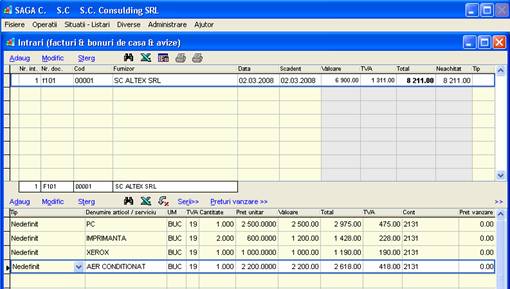 Pentru efectuarea acestei aplicatii vom intra în meniul Operatii - Intrari pentru a înregistra achizitia si în Operatii - Jurnal banca pentru a opera plata facturii.