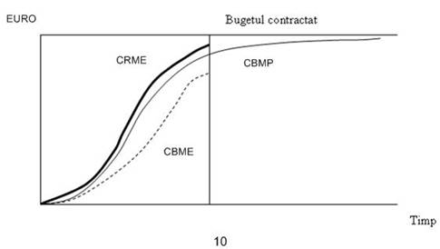 Costul bugetat al volumului de munca executat (il vom prescurta CBME). Aceasta valoare mai este denumita si valoare adaugata. Ne vom raporta la diagrama cumulativa a valorii volumului de munca efectiv finalizat. Valorii volumului de munca realizata ii este atribuit bugetul care a fost estimat pentru acel volum de munca. Pe aceeasi axa a timpului reprezentam costul cumulativ al volumului de munca desfasurata (costul real al acesteia). Valoarea adaugata este trasata pentru fiecare perioada de timp avand ca baza activitatea reala indeplinita.