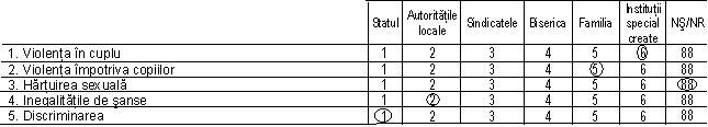 Tabelele centralizatoare vor fi completate de catre coordonatorul județean pe baza documentelor primtie de la operatori IV. SELECȚIA PERSOANELOR De regula interviurile vor fi realizate cu femei si barbati cu vārste peste 15 sau peste 18 ani (15 sau 18 ANI ĪMPLINIŢI ), care sa locuiasca efectiv la adresa respectiva - au locuit de cel putin 30 de zile la adresa respectiva. Nu se considera eligibile persoanele aflate īn vizita la adresa respectiva sau care locuiesc o perioada scurta de timp la adresa respectiva (mai putin de 30 de zile)!!! La fiecare gospodarie identificata veti face interviu unei singure persoane. Daca īn gospodarie se afla mai multe persoane eligibile (mai mult de doua persoane cu vārste peste 15 sau peste 18 ani) veti face interviu persoanei care īsi serbeaza prima ziua de nastere. IMPORTANT! Īn cazul īn care persoana selectata nu este acasa si aceasta nu lipseste pentru mai mult de o saptamāna (persoana respectiva este la serviciu, la scoala, īn delegatie etc.) veti programa o revizita la gospodaria respectiva. Este foarte important sa faceti interviul persoanei selectate!!! Īn acest sens veti face cel putin trei īncercari (REVIZITE) pentru intervievarea persoanei selectate. NOTAŢI SITUAŢIA ĪNTĀLNITĂ PENTRU FIECARE VIZITĂ ĪN CALENDARUL VIZITELOR DE PE CHESTIONARUL DE GOSPODĂRIE! Persoana eligibila: orice persoana cu vārsta peste 15 sau peste18 ani. Persoanele eligibile trebuie sa aiba 15 sau 18 ani īmpliniti īn momentul interviului (o persoana care īmplineste 15 sau 18 ani peste trei zile de la data realizarii vizitei NU este eligibila). Aceasta persoana trebuie sa locuiasca efectiv la adresa respectiva - a locuit sau va locui cel putin 30 de zile la adresa respectiva. Gospodarie: persoane care locuiesc si se gospodaresc singure (gospodarii de o singura persoana) SAU doua sau mai multe persoane care locuiesc īmpreuna īn mod obisnuit si care se gospodaresc (cheltuiesc acelasi buget) īn comun. Regula zilei de nastere: Veti aplica chestionarul persoanei care īsi serbeaza prima ziua de nastere de la momentul vizitei. Exemplu: daca īntr-o gospodarie locuiesc trei persoane eligibile nascute īn urmatoarele zile: 15 mai, 11 iunie, 30 septembrie iar data la care dvs. realizati studiul este 20 iulie, persoana selectata pentru interviu va fi aceea care īsi serbeaza ziua pe 30 septembrie. V. INSTRUCŢIUNI PENTU COMPLETAREA CHESTIONARULUI INDIVIDUAL Chestionarul individual contine mai multe tipuri de īntrebari. 1. Mama ar trebui sa stea acasa cu copilul/ii 2. Tata ar trebui sa stea acasa cu copilul/ii 3. Unul din parinti, indiferent care, ar trebui sa stea acasa cu copilul/ii 3. Statul / primaria ar trebui sa preia īngrijirea copiilor īn crese si gradinite 4. Patronii si institutiile publice sa faca crese si gradinite pentru copiii angajatilor 5. Bunicii sau rudele sa īngrijeasca copilul/ii. 6. Sa angajeze pe cineva 88. Ns/NR Īntrebari la care variantele de raspuns NU trebuie citite de operator sunt scrise cu litere majuscule: EXEMPLU: F7. Care credeti ca este principalul obstacol pentru un tānar pentru obtinerea unui credit pentru cumpararea sau constructia unei locuinte? RĂSPUNS UNIC! NU CITI VARIANTELE! RĂSPUNS UNIC! CITEsTE VARIANTELE! sau RĂSPUNS MULTIPLU! NU CITI VARIANTELE! Codurile din dreptul fiecarei īntrebari se īncercuiesc. EXEMPLU: F1. Care considerati ca este cea mai importanta problema a tinerilor din Romānia din ziua de astazi? RĂSPUNS UNIC! CITEsTE VARIANTELE! Educatia deficitara din scoala Lipsa unei locuinte Lipsa locurilor de munca Lipsa unor modele pe care sa le urmeze Lipsa educatiei adecvate īn familie Implicarea sociala scazuta NU sTIE DACA GREsIŢI, taiati cu un X codul īncercuit gresit si selectati raspunsul corect. EXEMPLU: H8. Īn opinia dumneavoastra, care sunt cele mai important lucruri pentru ca o scoala sa fie socotita buna? RĂSPUNS MULTIPLU! NU CITI VARIANTELE! Profesorii buni Dotarea scolii Rezultatele elevilor la scoala Rezultatele elevilor dupa absolvire Calitatile conducerii scolii Seriozitatea Prestigiul, renumele, traditia scoala sa fie de stat scoala sa fie gratuita Altceva____________________ NU sTIE Nu conteaza cāt de multe stersaturi sau taieturi faceti pe chestionar. Important este ca datele sa fie corect culese. Īntrebarile tip tabel se completeaza īncercuind īn dreptul fiecarei afirmatii varianta de raspuns corespunzatoare. EXEMPLU: H24. Dupa parerea dvs. cine ar trebui sa se ocupe īn primul rānd de urmatoarele probleme dintr-o societate? UN RĂSPUNS PE FIECARE LINIE