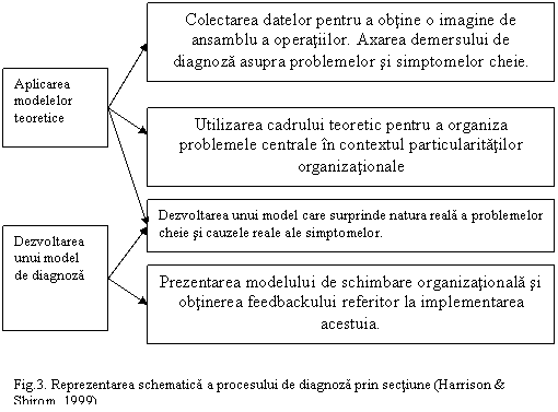 Pentru a-i ajuta pe consilieri si pe manageri sa corecteze neajunsurile datorate utilizarii unui singur model teoretic in sprijinul demersului de diagnoza organizationala, Harrison si Shirom (1999) au propus o abordare pe care au denumit-o diagnoza prin sectiune. Adaptarea acestei strategii de diagnostic, permite practicianului sa treaca rapid de la observarea / identificarea datelor de baza ale problemei, la identificarea cauzelor acesteia. Permite de asemenea evaluarea necesitatii de schimbare organizationala, precum si a resurselor de care organizatia dispune pentru aceasta. In stadiul final, aceasta metoda permite colectarea unor metode eficiente in vederea implementarii schimbarii daca aceasta este necesara.