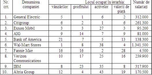 Tabelul nr. 53 Clasamentul primelor 10 companii americane dupa marimea cifrei de afaceri īnregistrata īn anul 2002 (Forbes, 26.03.2003)
