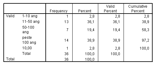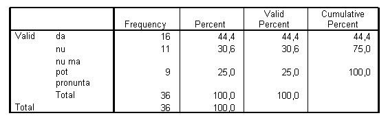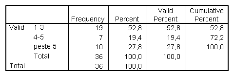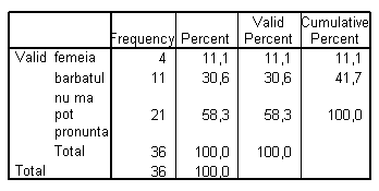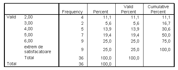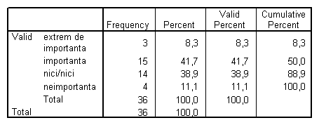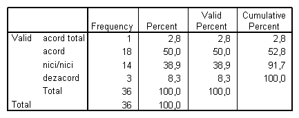 Deci rezultatele obtinute în cadrul studiului cu ajutorul unui esantion de 36 de subiecti sunt garantate cu o eroare admisa de 16,3%, la un nivel de încredere de 95%.