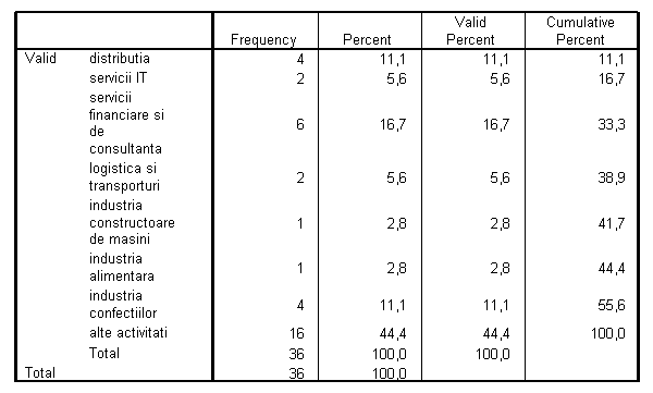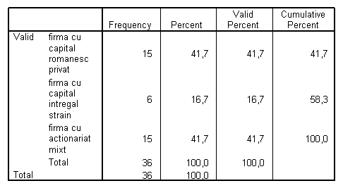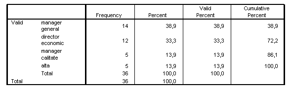 Subiectii (N=36) solicitati pentru completarea chestionarului ocupa functii de conducere diferite in diverse firme (la o singura firma mi-au raspuns 2-3 persoane) din orasul Targoviste judetul Dambovita.