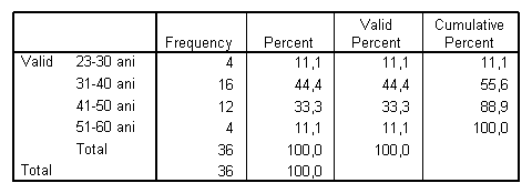 Pentru demonstrarea celor trei ipoteze am folosit urmatoarele instrumente statistice cum ar fi: frecventa relativa (Frequency) , frecventa absoluta (Valid Percent) si analiza legaturilor dintre doua variabile cu ajutorul tabelelor de contingenta (ANALIZA BIVARIATA).