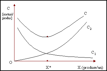 Fig. 2. Variatia costurilor unitare: C - costul total, C1 - costul de productie si