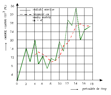 De aici este evident ca oricare din cele 3 alternative de prognoza asigura un efect pozitiv pentru firma. Efectul maxim este asigurat de aplicarea prognozei prin metoda mediei mobile cu n=4. Efectul economic E adus firmei prin aprovizionarea saptamânala cu cantitatile prognozate prin metoda mediei mobile reprezinta: Cantitatea prognozata pentru saptamâna 16, cu media mobila de ordin n=4, va fi: Prognoze prin extrapolarea tendintei Metodele mediei mobile si ajustarii exponentiale sunt aplicabile în prognozele pe termen scurt, de pe o zi pe alta, de pe o luna pe alta, de pe un trimestru pe altul. Ca atare ele sunt utile în mod deosebit pentru elaborarea planurilor de actiune si la controlul îndeplinirii planurilor curente. în care Tipul de functie matematica asociat seriei se identifica prin metoda diferentelor finite dupa cum urmeaza: 1) Daca