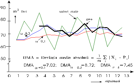 exponentiala cu Asadar, pentru cazul de fata alegerea metodei optime de prognoza necesita rationamente suplimentare. Spre a efectua aceste rationamente se precizeaza ca erorile cu (+) semnifica o subaprovizionare fata de cererea reala, iar cele cu (-), o crestere inutila a stocului. Trebuie calculate, prin urmare, pierderile cauzate statiei de fiecare din cele 3 alternative de prognoza. În ipoteza admiterii unui pret de 750 lei/litrul de benzina, a unei rentabilitati a statiei de benzina de 5% fata de vânzari si a dobânzii de 90% pentru creditarea stocurilor , pierderile asociate celor 3 alternative de prognoza sunt sistematizate în tabelul 7.5. În vederea evaluarii pierderilor s-au însumat, pe baza tabelului 7.4, erorilor cu (+) si cele cu (-) la fiecare alternativa de prognoza, rezultând: pentru ajustarea cu pentru ajustarea cu a=0,3 , erori cu (+) 41,7 tone, erori cu (-) 54,3 tone; pentru media mobil\ cu n=4, erori cu (+) 32,2 tone, erori cu (-), 49,85 tone. În urma calculelor economice prin care se evidentiaza pierderile datorate erorilor de prognoza, rezulta ca alternativa de prognoza cea mai buna este cea care foloseste media mobila cu n=4. Tabelul 7.5 Pierderile datorate erorilor de prognoza pentru o statie de benzina în decursul a 11 sapamâni în cazul a 3 alternative de prognoza