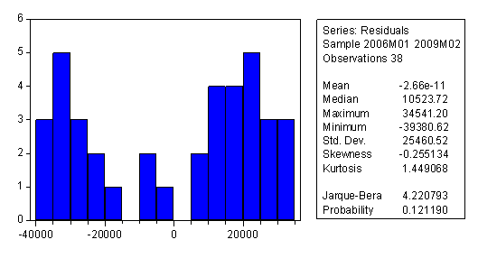 Verificarea ipotezei de normalitate a erorilor presupune compararea histogramei erorilor cu Clopotul lui Gauss. Se stie ca acesta este caracterizat prin doi parametri - coeficientul de asimetrie, = 0 respectiv coeficientul de boltire, = 3. Se spune despre erorile unui model econometric ca sunt distribuite normal daca intre valorile si ce caracterizeaza histograma erorilor si valorile standard ale Clopotului lui Gauss, 0 si 3, nu exista diferente semnificative din punct de vedere statistic. In cazul nostru aceste valori sunt coeficientul de asimetrie, Skewness, = -0,255 respectiv coeficientul de boltire, Kurtosis, =1,449. Dupa cum se observa, histograma erorilor este aproximativ simetrica, deoarece valoarea coeficientului de asimetrie este apropiata de zero,iar legat de boltire, histograma erorilor este mai plata decat Clopotul lui Gauss, intrucat <3. Problema care se pune in acest moment este aceea de a verifica daca diferentele intre = -0,255 si valoarea standard = 0 respectiv =1,449 respectiv valoarea standard =3, sunt semnificative din punct de vedere statistic sau nu. In acest scop se foloseste testul Jarque Bera. Se emit ipotezele: