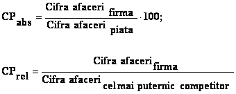 Datele prezentate in tabelul de mai sus au luat in considerare primele 5 firme de pe piata comertului cu rechizite si articole de papetarie. Pentru aceasta s-au folosit indicatori prezentati in bilanturile contabile ale firmelor respective, pentru anul 2006. Se poate observa, prin calcule simple, ca ponderea acestora insumeaza 61.62 %, adica mai mult de jumatate din totalul industriei aferente. Restul de 38.38 % este acoperit de firme mici, cu ponderi reduse. Formulele folosite pentru determinarea cotei de piata in valoare absoluta si relativa sunt urmatoarele: