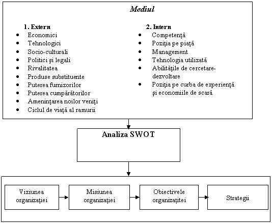 Factorii de mediu intern se refera la determinarea punctelor interne tari pe care se poate baza organizatia si care trebuie exploatate, precum si a punctelor slabe ale firmei care trebuie evitate.